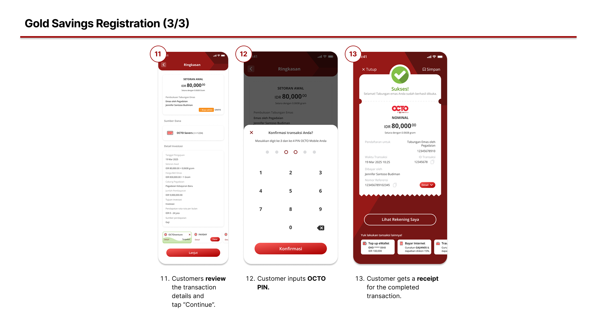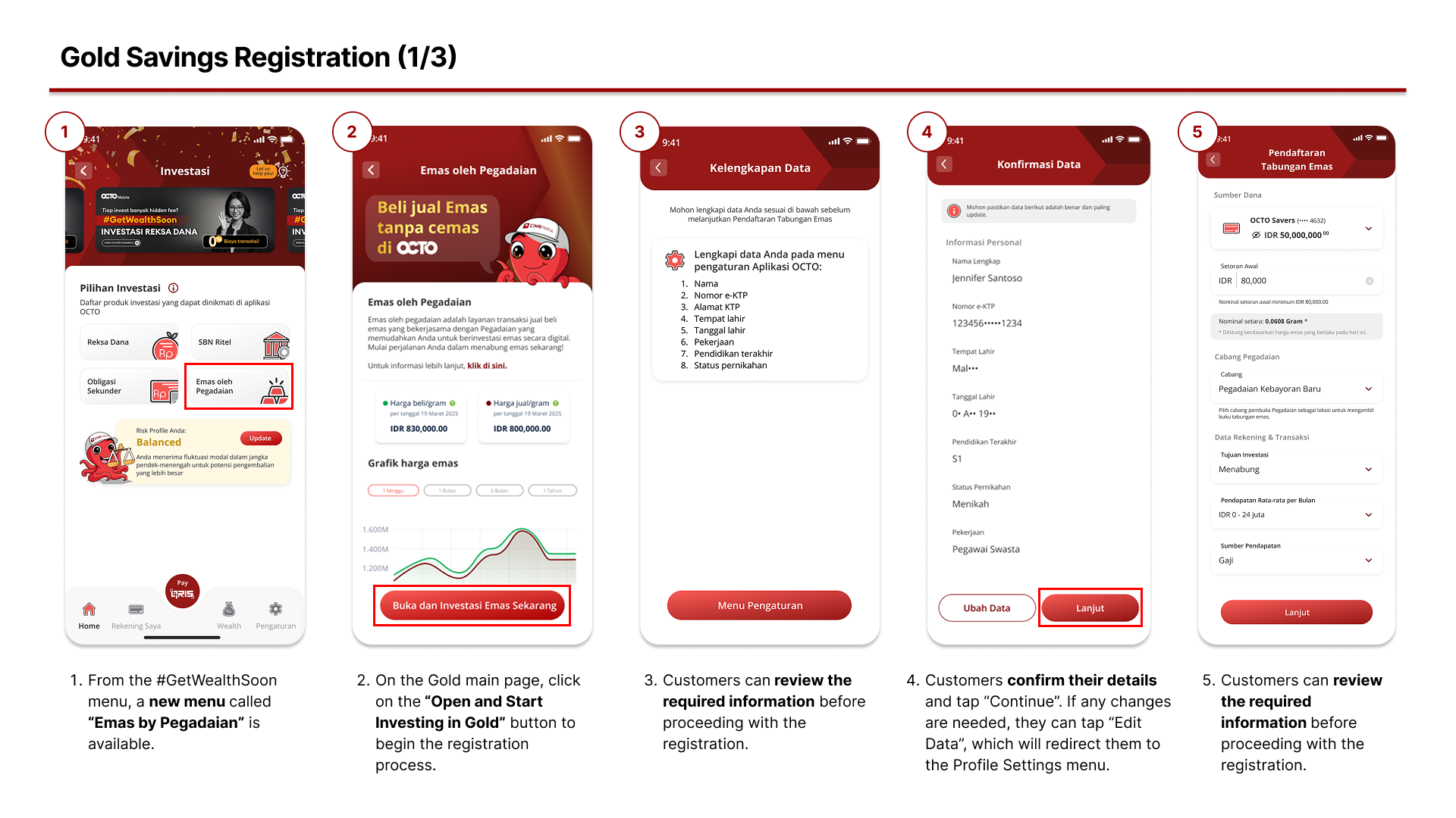 - How do I register for Gold Savings by Pegadaian through the OCTO App? To register, open the OCTO App, go to the #GetWealthSoon menu, then select Gold Savings by Pegadaian. Follow the registration steps by entering your personal details, initial balance amount, and other required information. Please note that Gold Savings registration is only available to customers who have at least one CASA account.