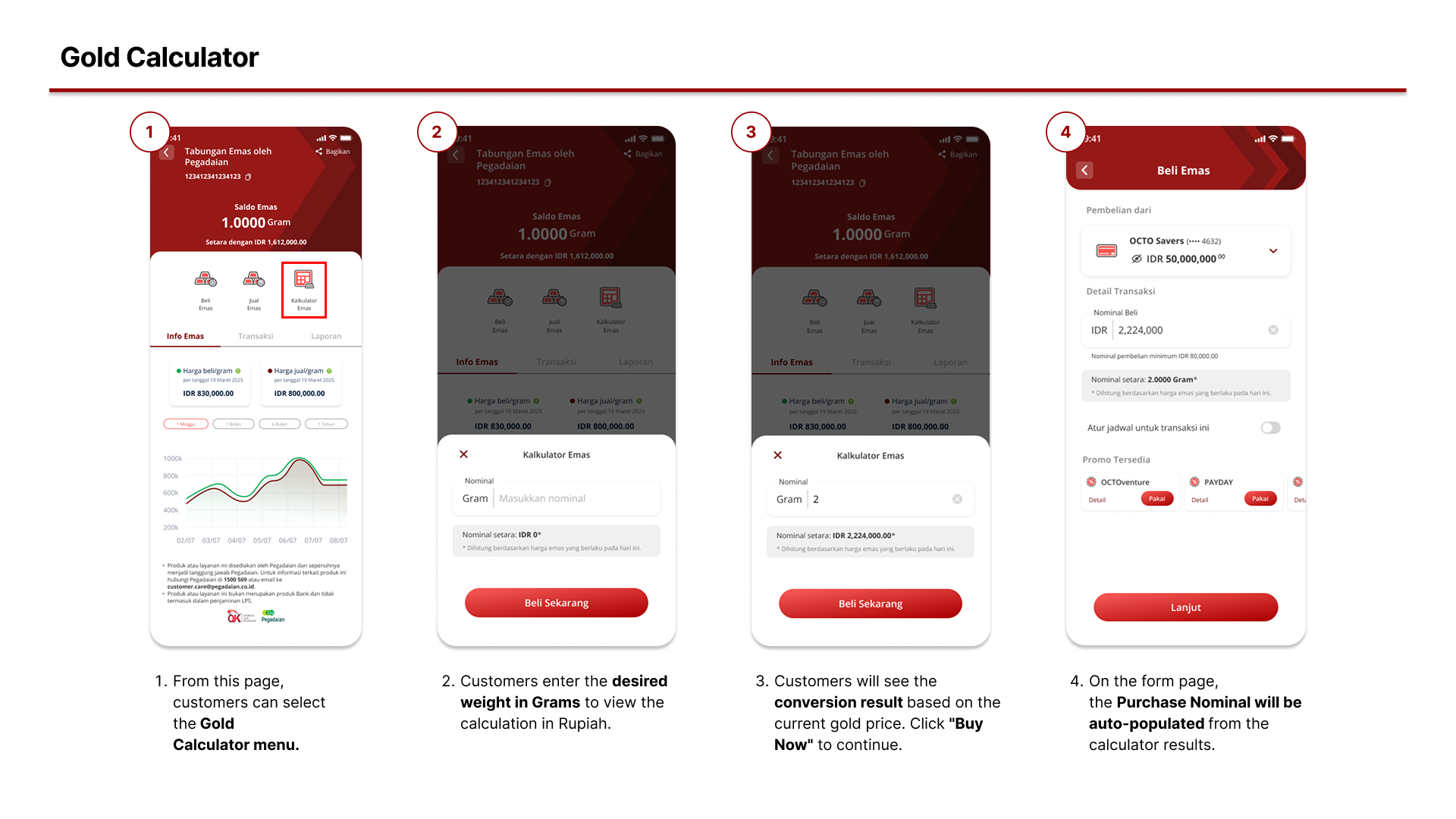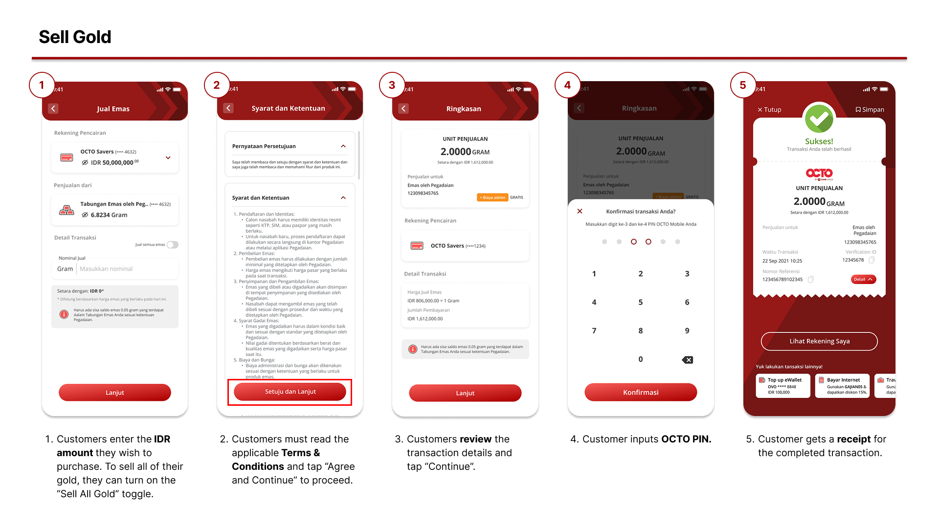 - Can I sell the gold I purchased through the OCTO App? Yes. To sell your gold, go to the Sell Gold menu under Gold Savings by Pegadaian, select the amount of gold you wish to sell, and the transaction will be processed automatically. The proceeds will be credited directly to your account.
