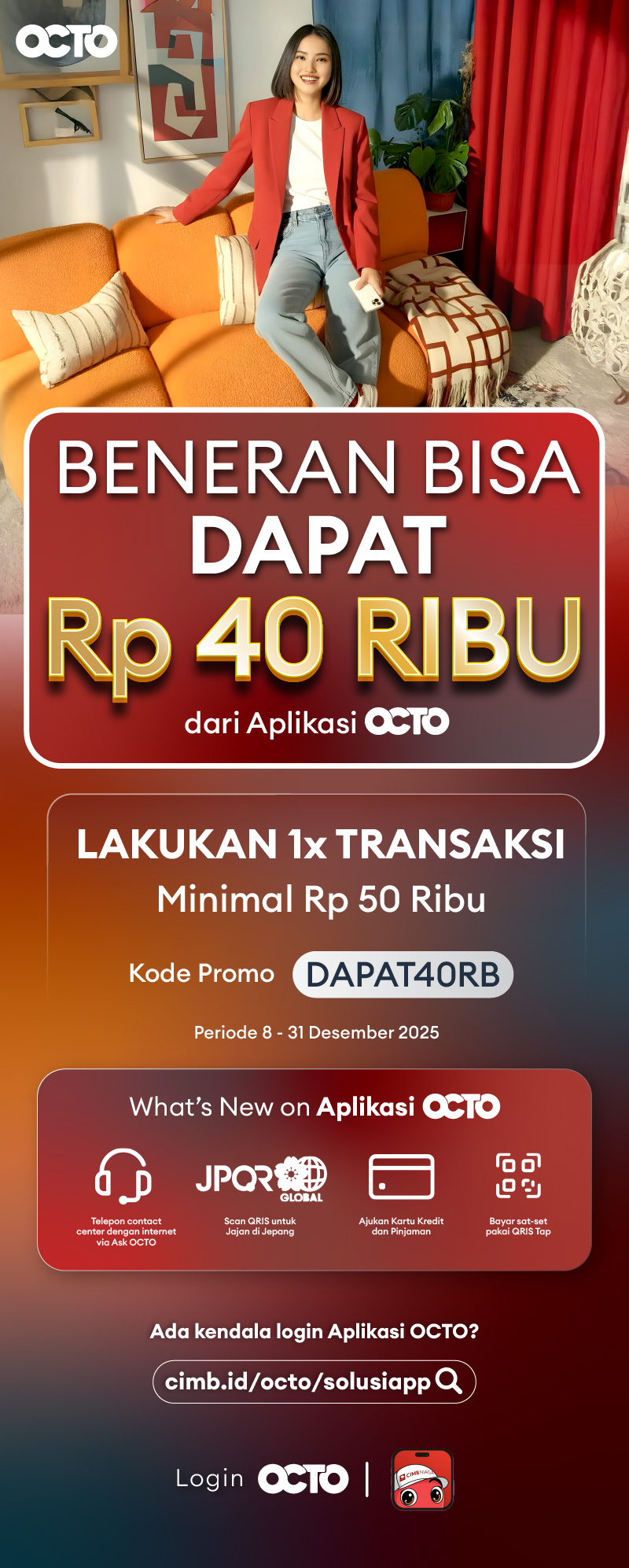 - Promo hanya berlaku untuk Pengguna Aplikasi OCTO terundang melalui email, WhatsApp, banner push notifications/pop up Aplikasi OCTO dan Telesales.