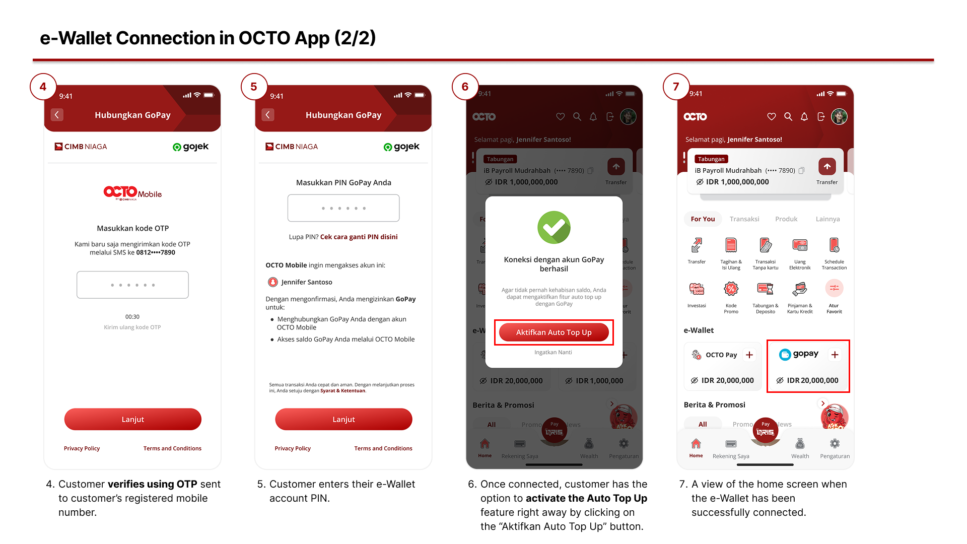 - What are the benefits of linking my e-Wallet to OCTO App? By linking your e-Wallet account to OCTO App, you can view your e-Wallet balance directly from both channels and enjoy the convenience of the auto top-up feature.