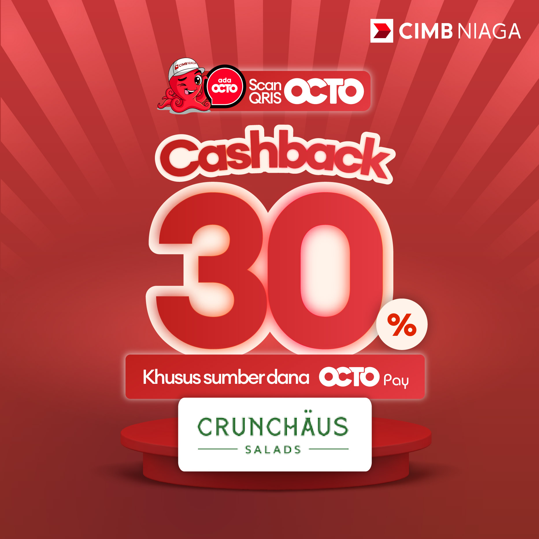 - Cashback 30% (maximum Rp 10,000) per transaction at Crunchaus Salads by scanning QRIS OCTO using OCTO Pay funds as payment method at QRIS CIMB Niaga