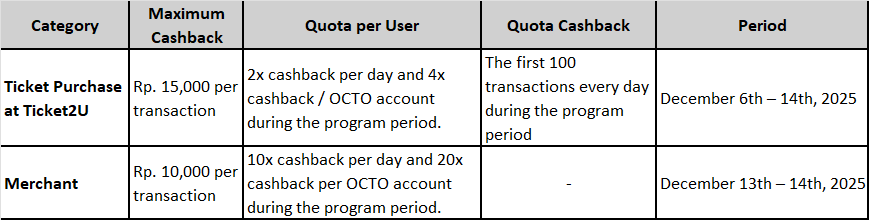 - The promotion applies to QRIS OCTO transactions on CIMB Niaga QRIS code using OCTO Pay, Savings, and CIMB Niaga Credit Card as the funding source.