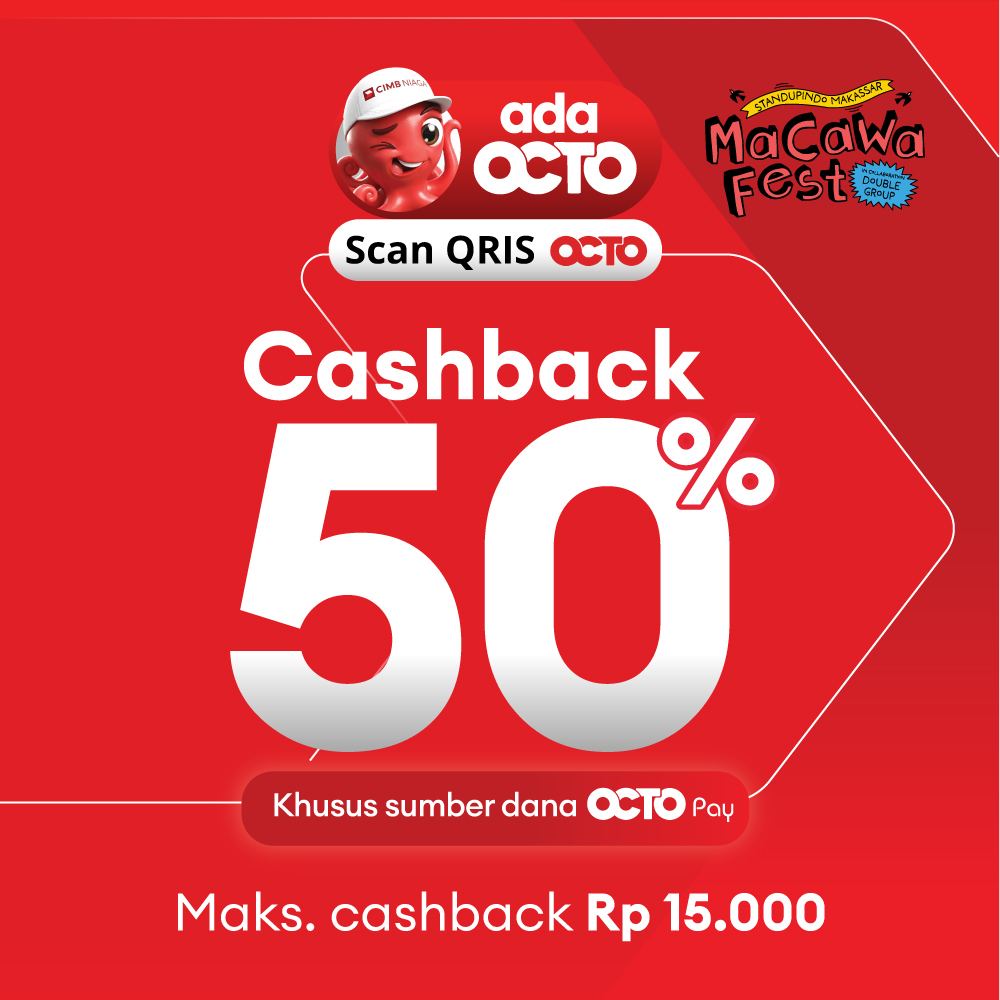 - Cashback 50% (maximum Rp 10.000) per transaction by scanning QRIS OCTO using OCTO Pay funds as payment method on QRIS CIMB Niaga