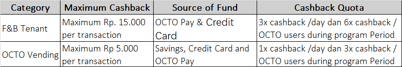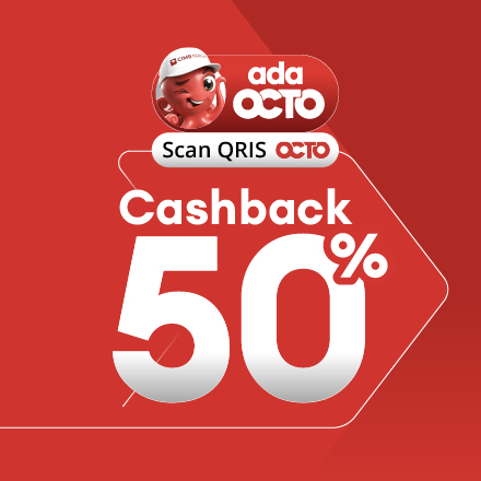 - Cashback 50% (maximum Rp 15.000) per transaction by scanning QRIS OCTO, detail below: