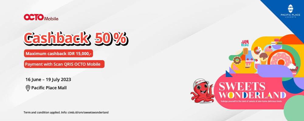 50% cashback at the Sweets Wonderland event, Pacific Place Mall, using the OCTO Mobile QRIS Scan