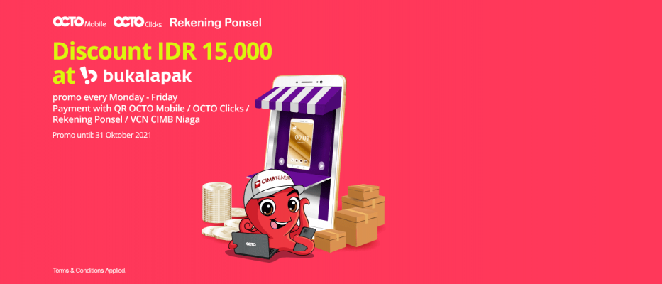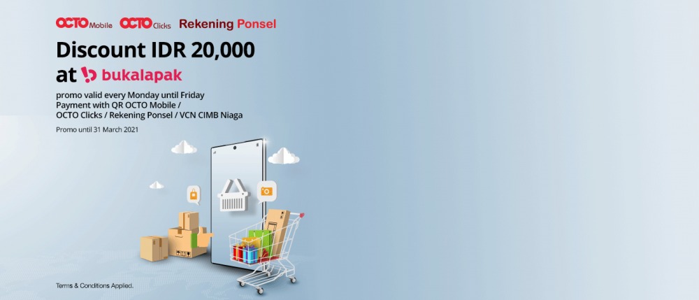 Discount Rp 20.000 at Bukalapak using QR OCTO Mobile, OCTO Clicks, Rekening Ponsel & VCN CIMB Niaga