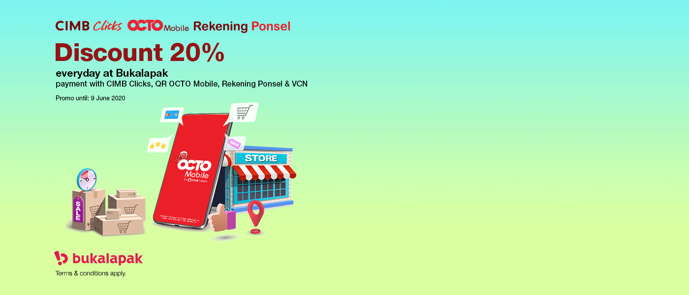 Discount 20% at Bukalapak with CIMB Clicks/ QR Go Mobile/ Rekening Ponsel/ VCN