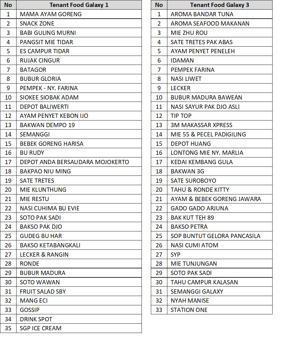List Tenant Food Galaxy, Galaxy Mall, Surabaya