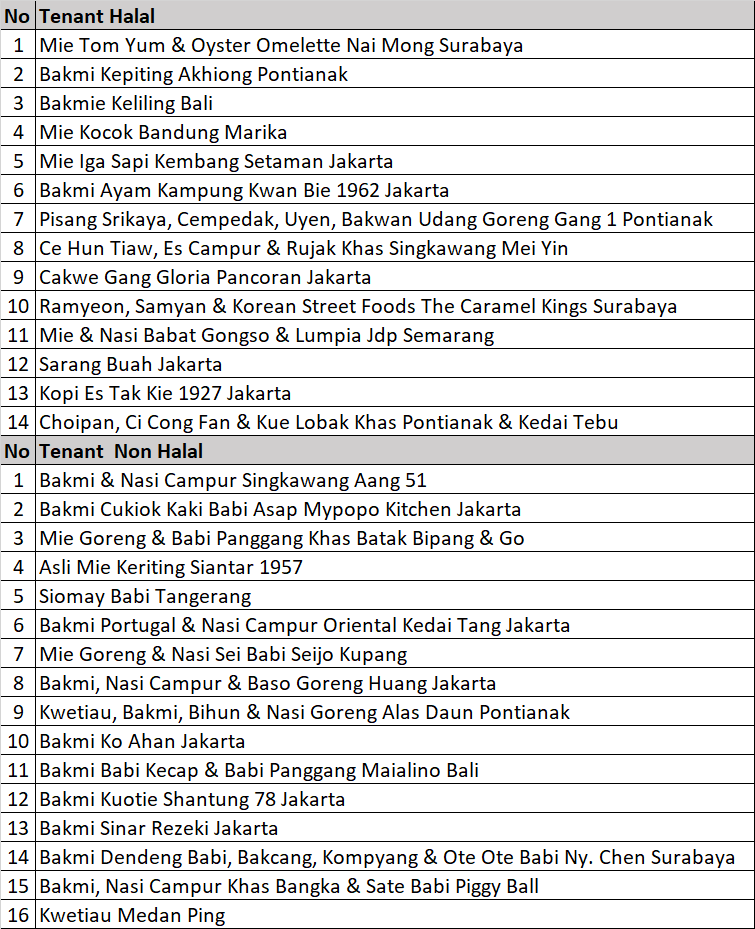 List Tenant Tirta Lie Bakmi Festival di South Beach Corridor, Discovery Mall Bali.