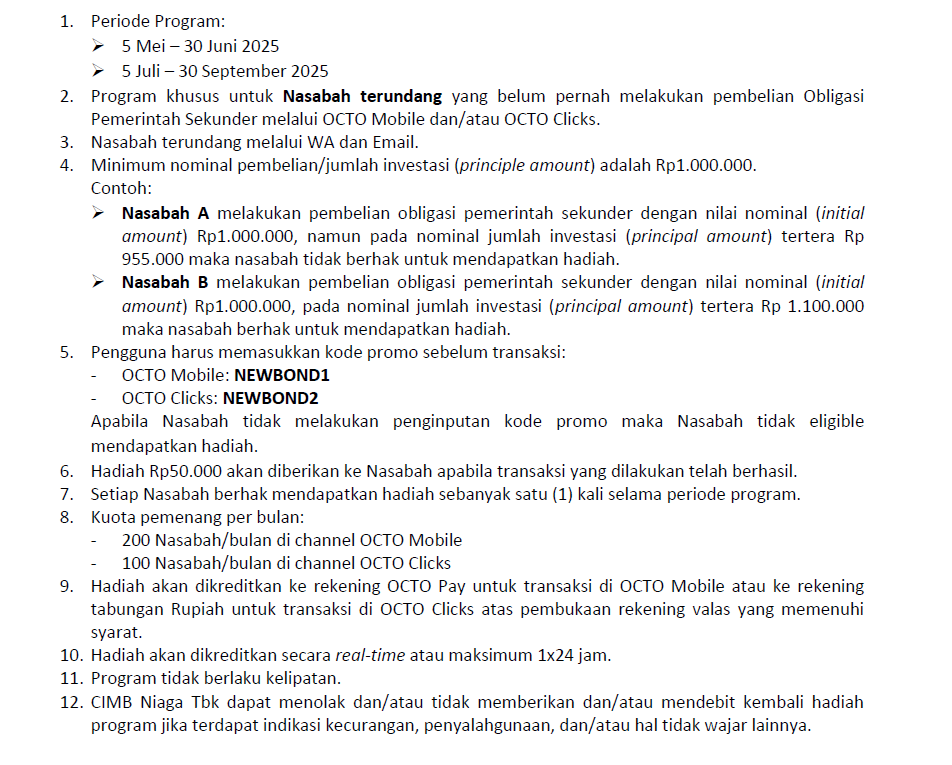 Pengguna dapat menyesuaikan preferensi dan relevansi untuk pesan promosi yang diterima dan media komunikasi yang digunakan dengan menghubungi Layanan CIMB Niaga 14041.