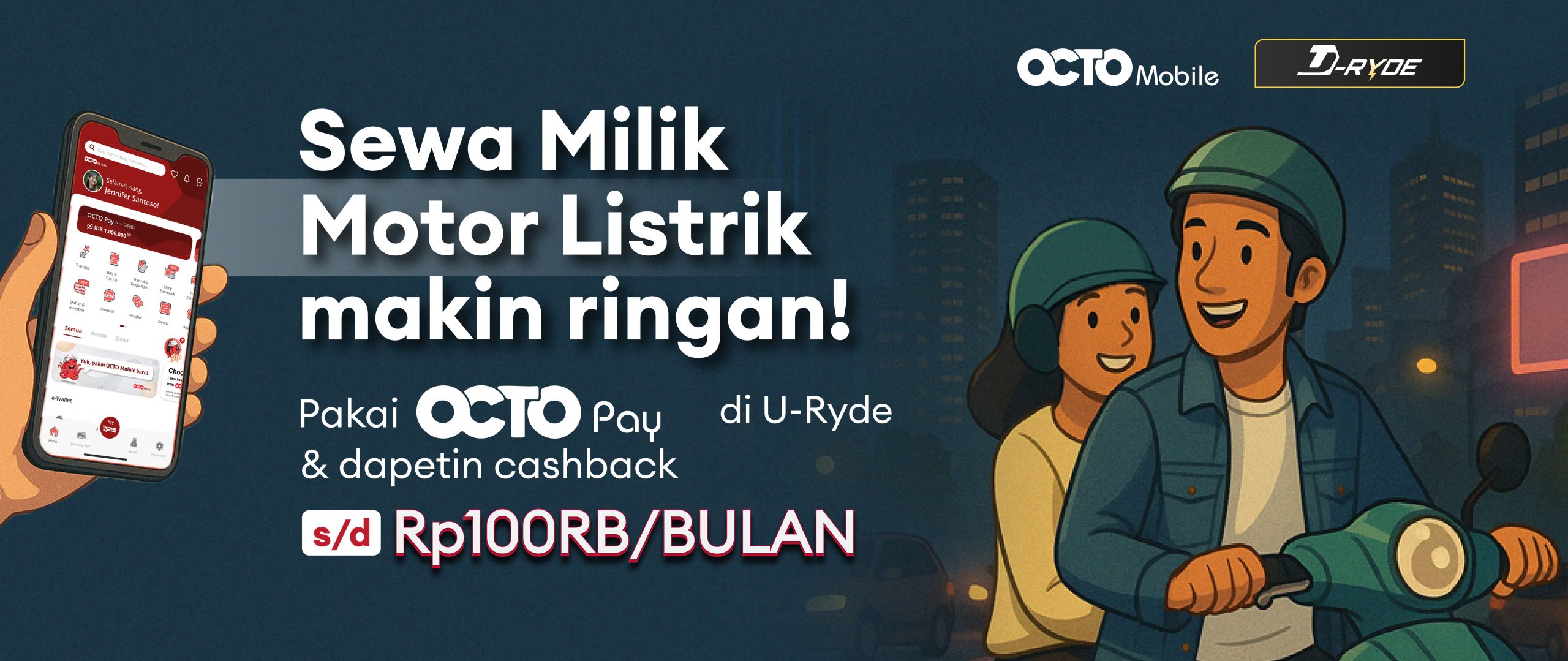 - Cashback Rp 5.000 per transaksi untuk pembayaran cicilan sewa motor listrik lewat aplikasi U-Ryde menggunakan metode pembayaran OCTO Pay & maksimal cashback 20x per bulan.