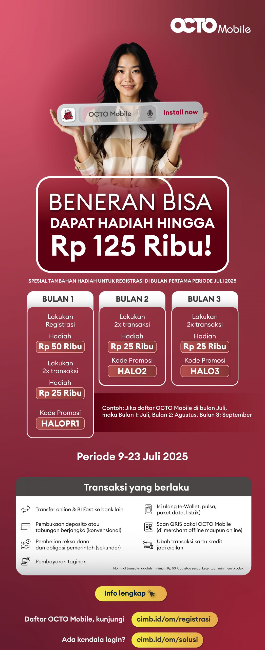 - Hadiah Rp50.000 berupa saldo OCTO Pay akan dikirimkan maksimum 30 hari kerja setelah periode promo selesai (setelah 30 April 2025).