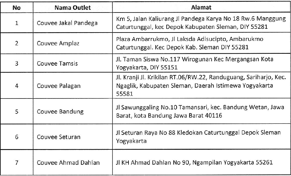 Daftar Outlet yang Berpartisipasi dalam Program Cashback 30% di Couvee Coffee Shop, Yogyakarta : Daftar Outlet Couvee Coffee Shop, Yogyakarta: