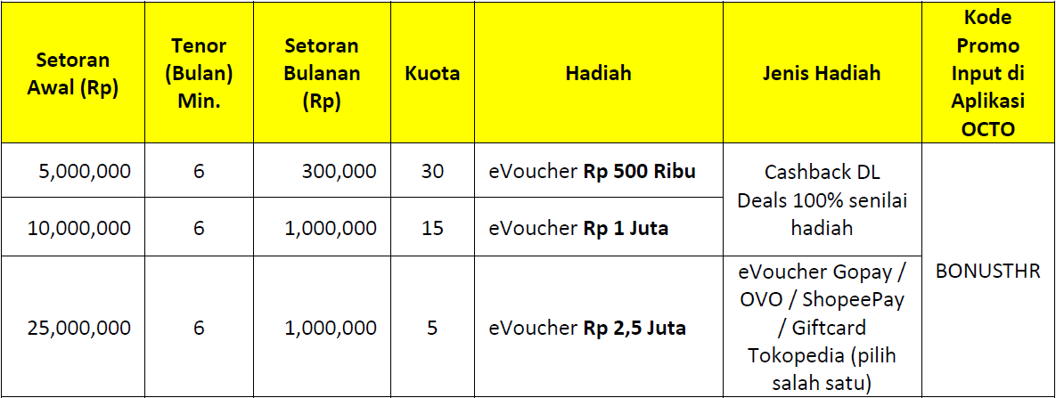 - Nasabah wajib memasukkan kode promo BONUSTHR di Aplikasi OCTO.