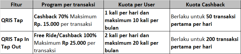 - Cashback untuk fitur QRIS Tap dan QRIS Tap In Tap Out di OCTO dengan rincian sebagai berikut :