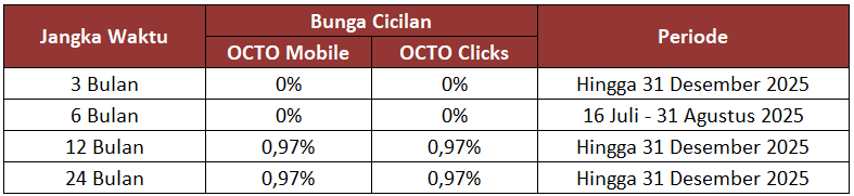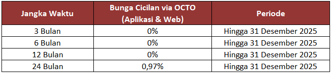 - Efektif 2 September hingga 31 Desember 2025 ubah transaksi ritel menjadi cicilan 0% 12 bulan via OCTO akan dikenakan biaya admin Rp100.000 per transaksi.