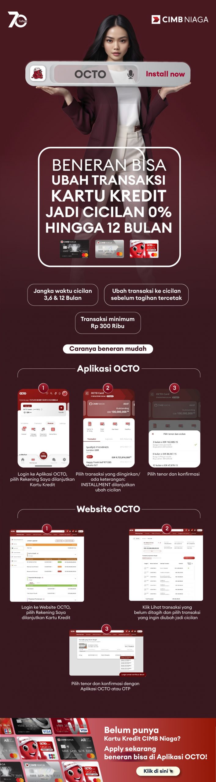 - Efektif 16 Juli hingga 31 Desember 2025 ubah transaksi ritel menjadi cicilan 0% 6 bulan via OCTO akan dikenakan biaya admin Rp50.000 per transaksi.