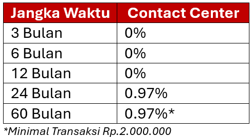 - Efektif 1 Januari 2025 ubah transaksi ritel menjadi cicilan 0% dengan Tenor 3 bulan via contact center akan dikenakan biaya admin Rp.50.000.