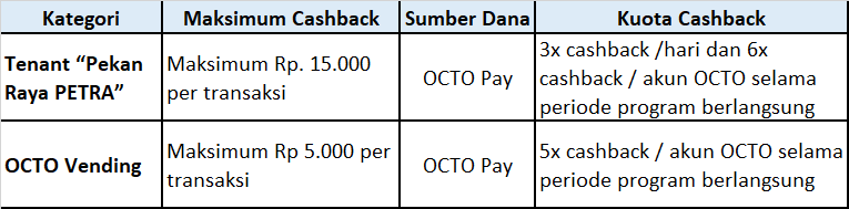 - Cashback 50% dengan scan QRIS OCTO dengan rincian sebagai berikut :