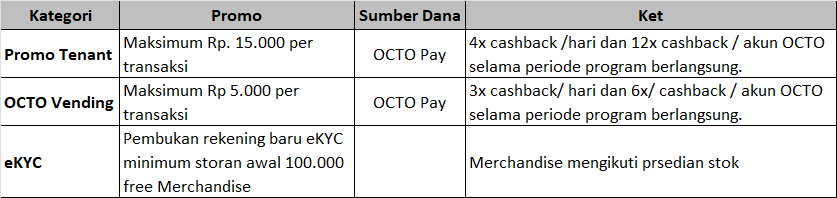- Cashback 50% dengan scan QRIS OCTO, dengan rincian sebagai berikut :