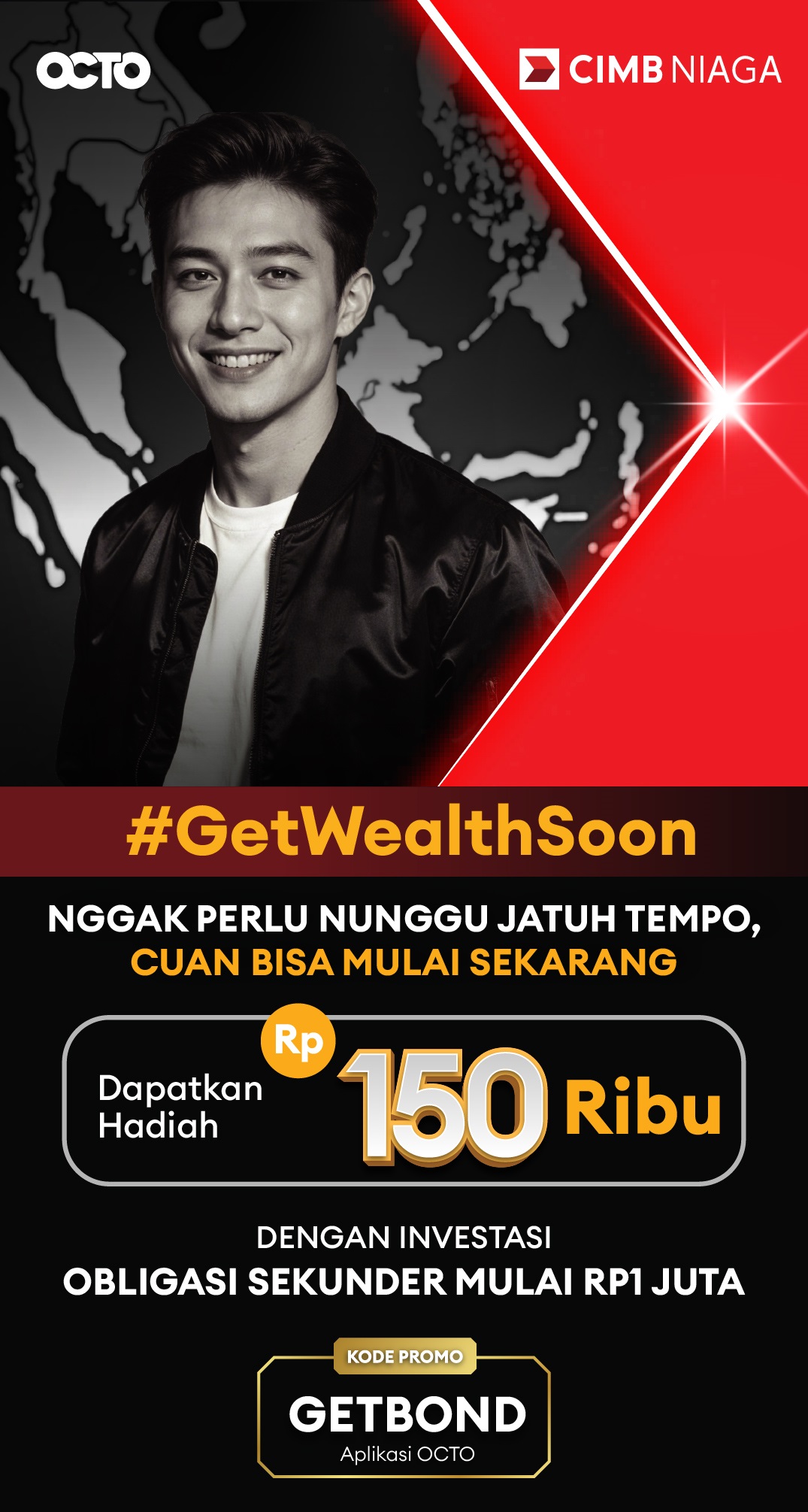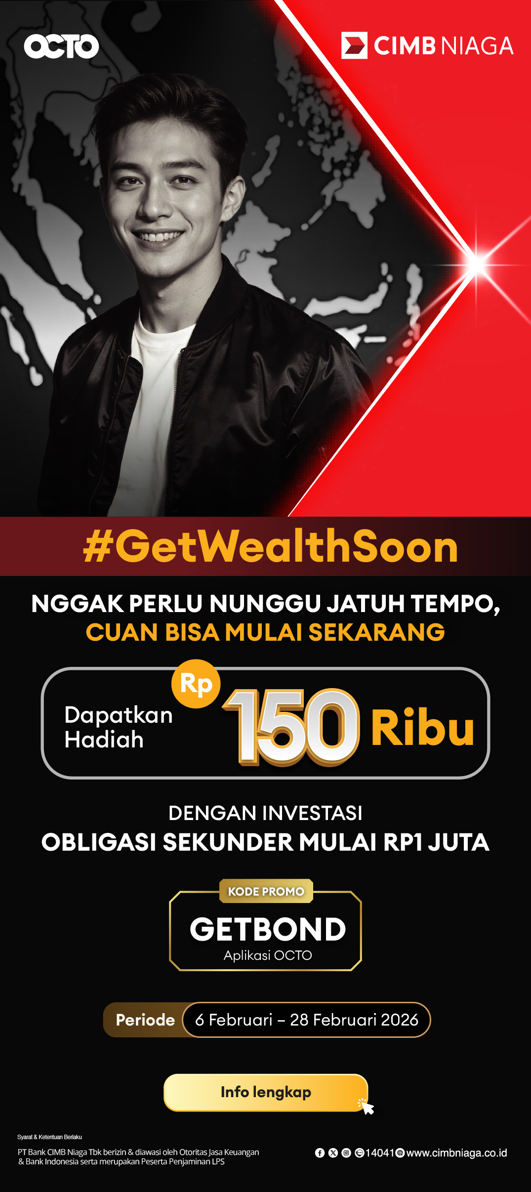 - Program ini berlaku untuk nasabah terundang khusus di Aplikasi OCTO yang melakukan pembelian Obligasi Negara denominasi Rupiah dan tidak berlaku untuk pembelian denominasi USD serta Obligasi Korporasi selama periode program.