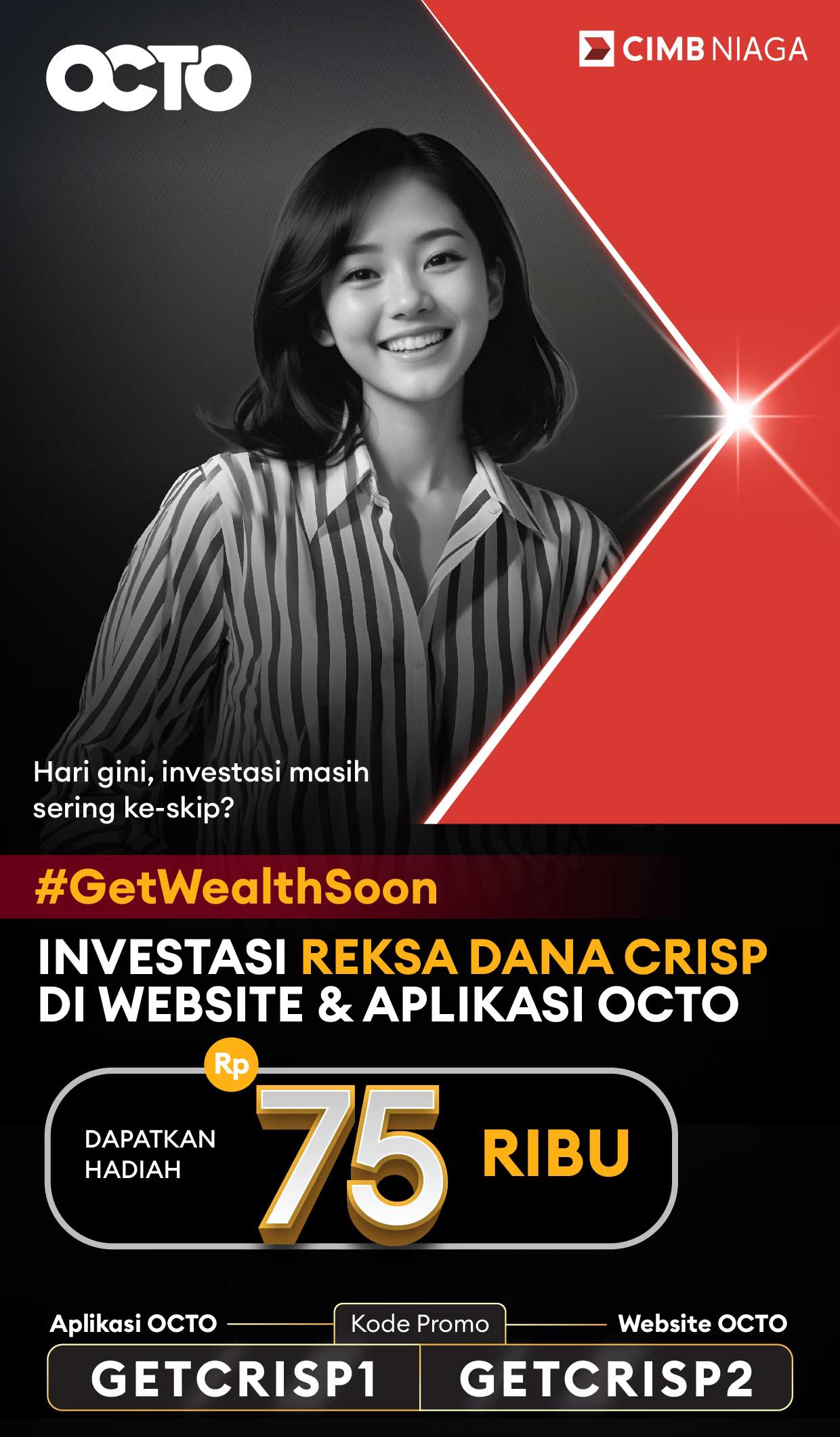 - Nasabah wajib melakukan satu (1) kali transaksi pembelian Reksa Dana jenis CRISP (termasuk jenis pasar uang) melalui Aplikasi/Website OCTO.