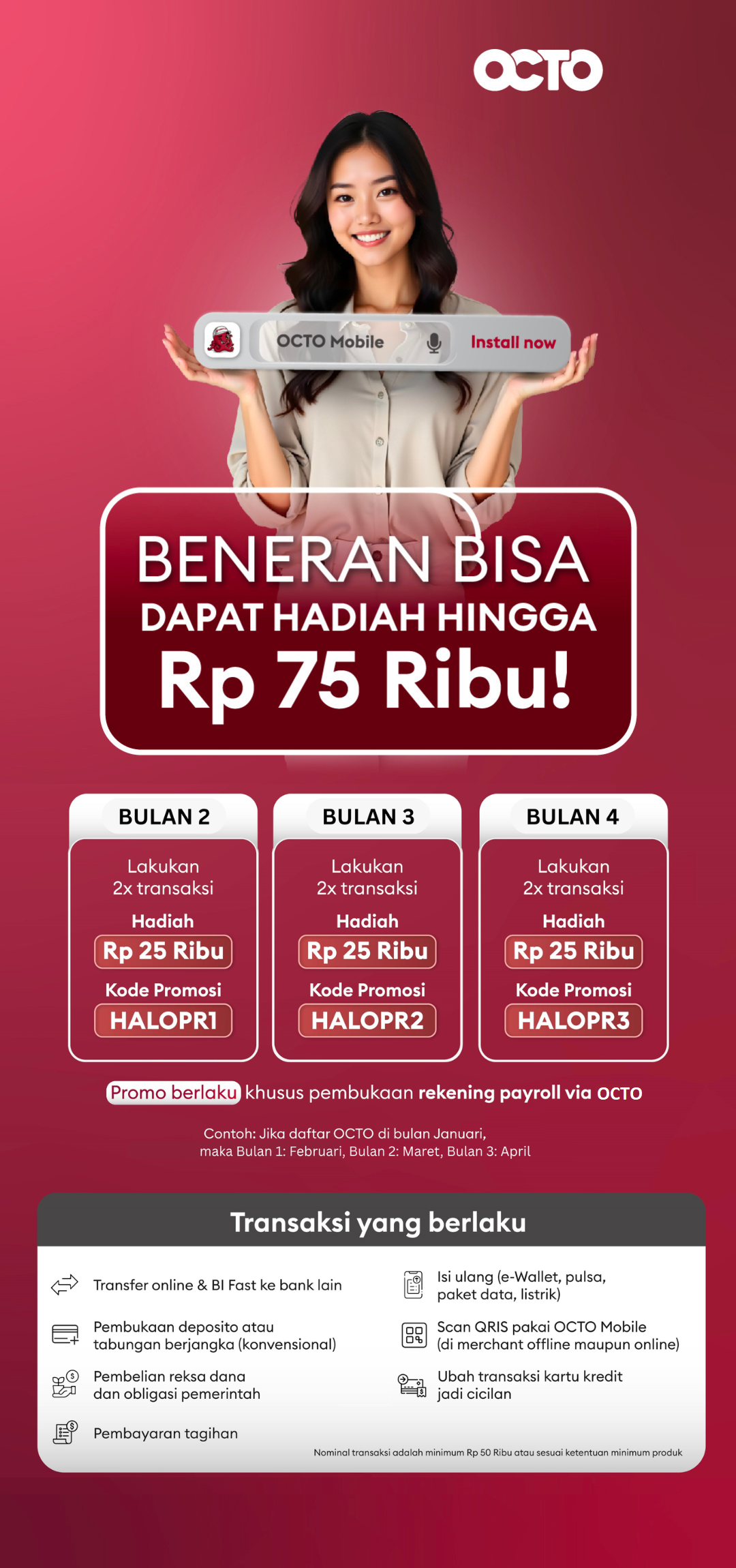- Promo berlaku untuk Pengguna baru OCTO yang melakukan pembukaan rekening Payroll via Online KYC OCTO di periode Juli-September 2025.