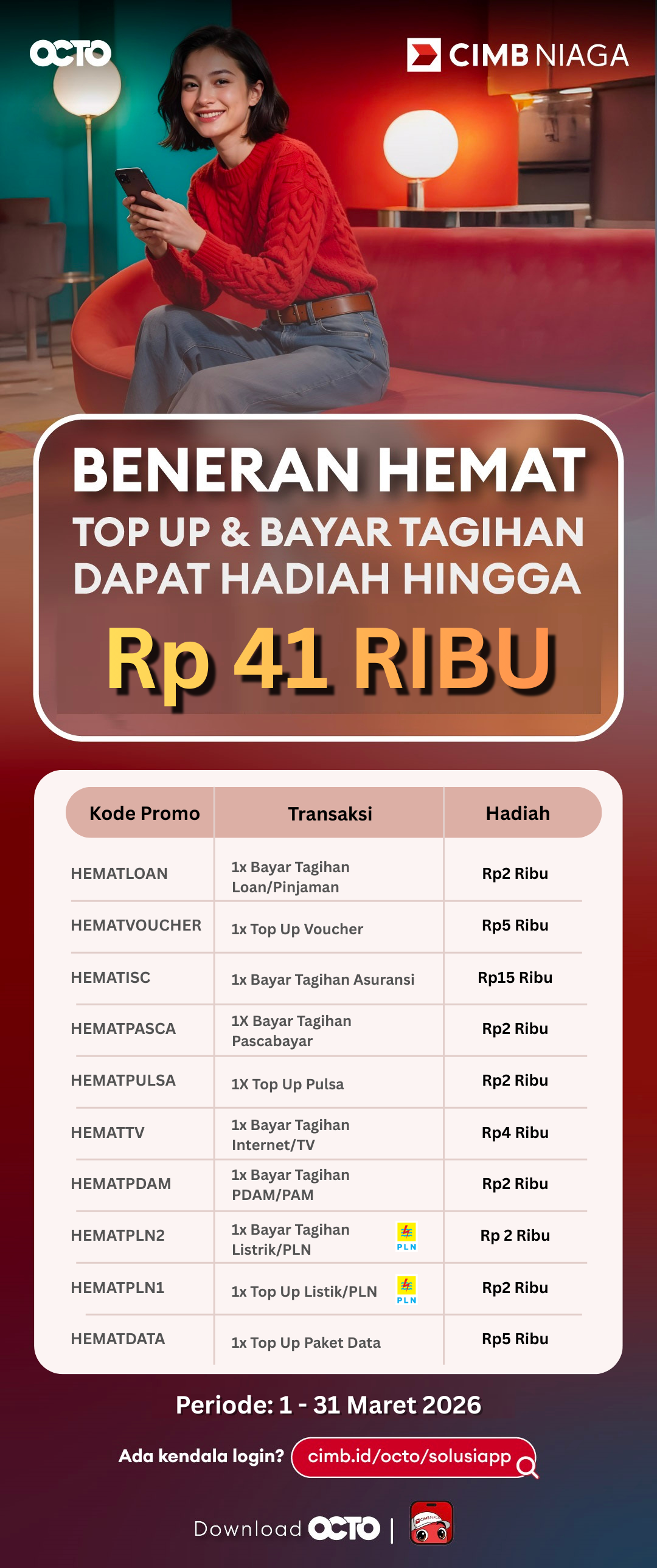 Minimum transaksi sebesar Rp50.000, kecuali kode promo HEMATLOAN minimum transaksi sebesar Rp250.000, kode promo HEMATVOUCHER minimum transaksi sebesar Rp45.000 dan kode promo HEMATISC minimum transaksi sebesar Rp500.000. Minimum nominal transaksi tidak termasuk biaya admin, biaya retribusi, atau biaya lainnya.