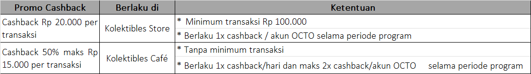 - Cashback hingga Rp 20.000 per transaksi dengan scan QRIS OCTO menggunakan sumber dana OCTO Pay sebagai metode pembayaran pada EDC/QRIS CIMB Niaga, dengan skema sebagai berikut :