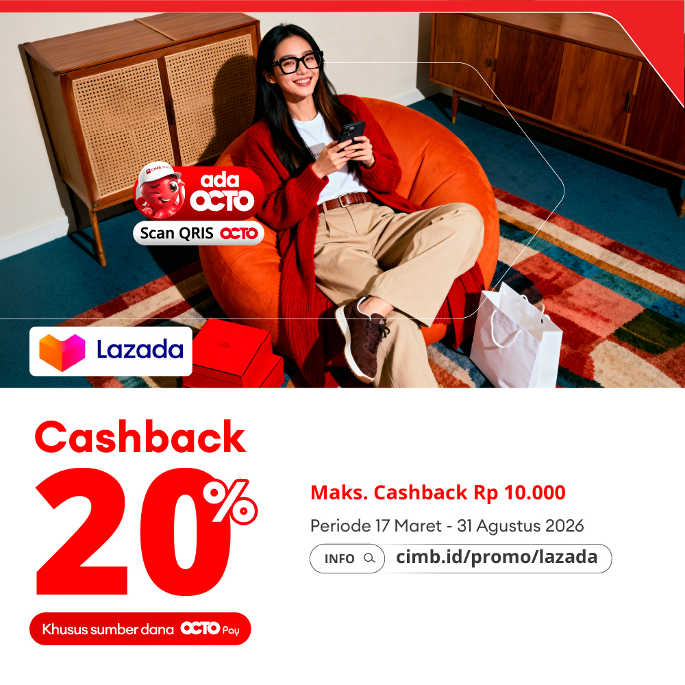 - Cashback 20% (maksimum Rp 10.000) per transaksi, di mobile aplikasi Lazada, pembayaran dengan scan QRIS OCTO.
