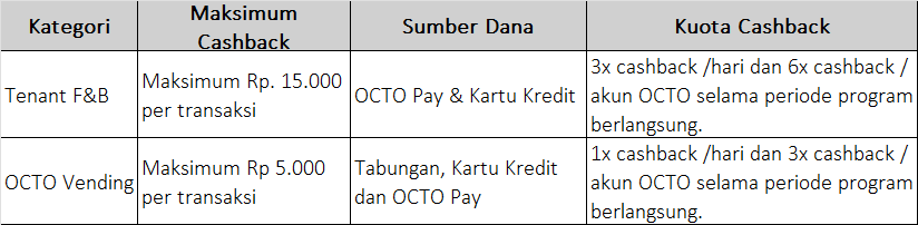 - Cashback 50% dengan scan QRIS OCTO, dengan rincian sebagai berikut: