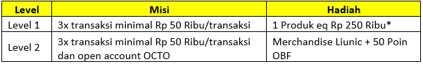 - Cashback 50% maksimal Rp15,000 dengan transaksi menggunakan OCTO.