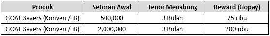 - Nasabah yang mengikuti program ini, tidak dapat menerima reward dari program pembukaan rekening GOAL Savers lainnya.