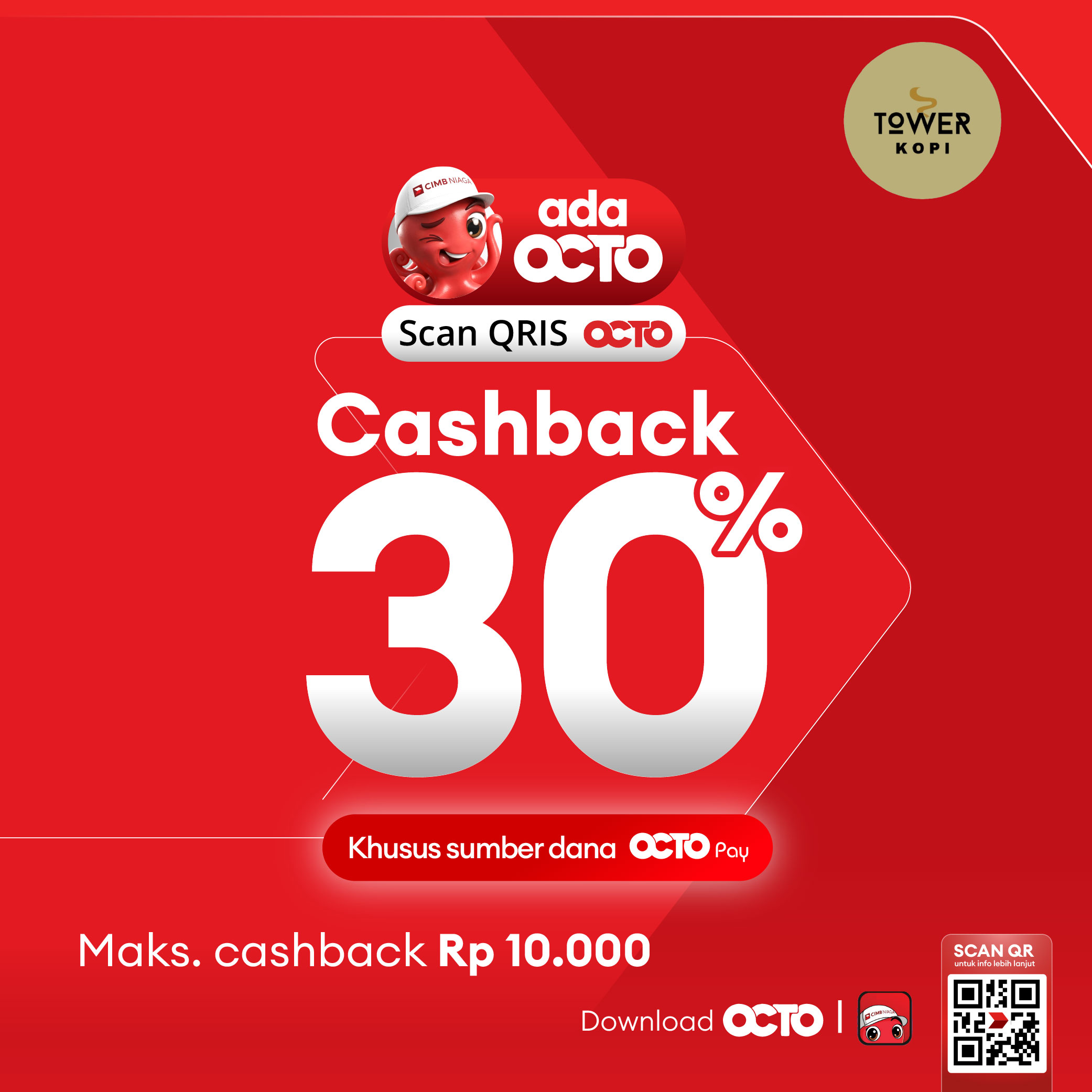 Cashback 30% di Tower Kopi, Singkawang dengan menggunakan QRIS OCTO