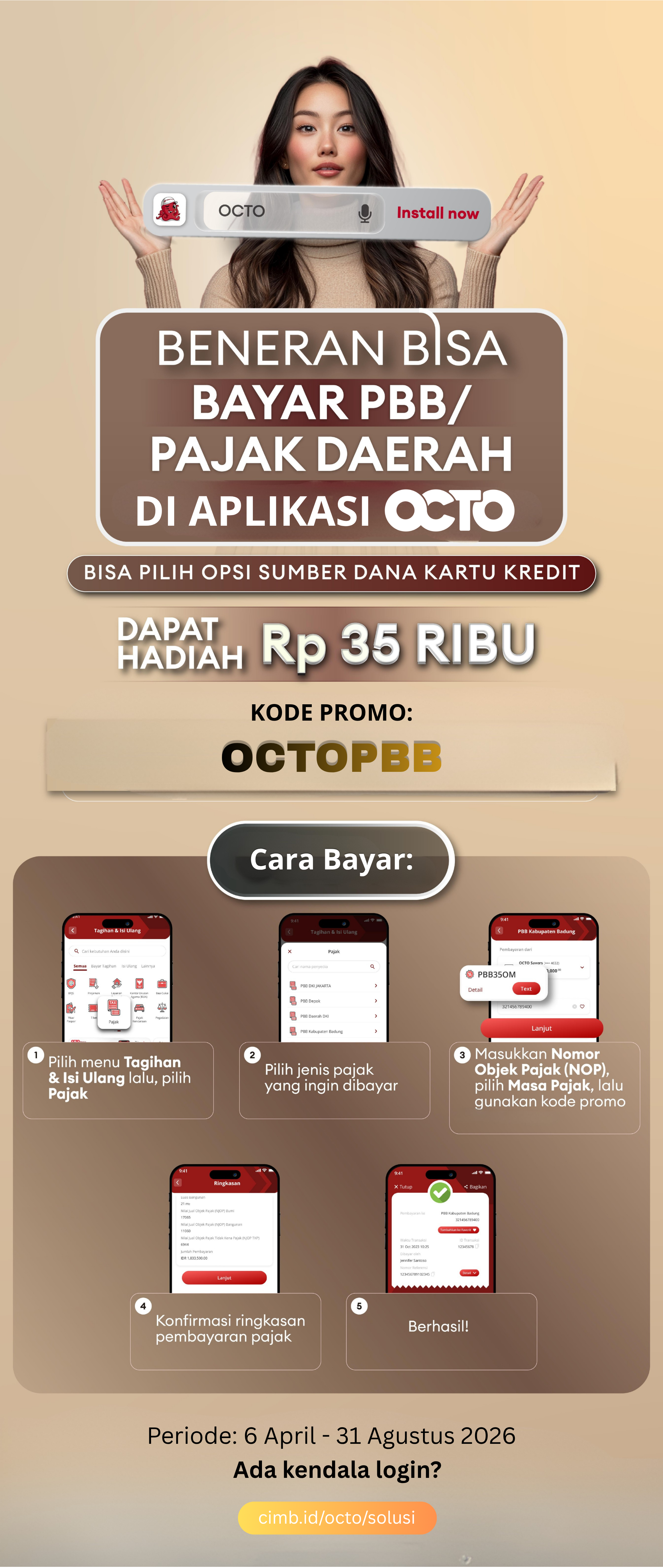Beneran bisa bayar PBB/Pajak Daerah di aplikasi OCTO dapat hadiah Rp 35 Ribu