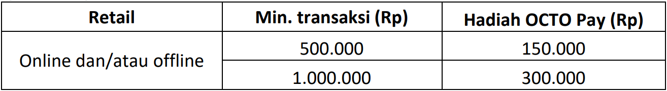- Hadiah akan diberikan kepada Nasabah dalam bentuk saldo OCTO Pay.