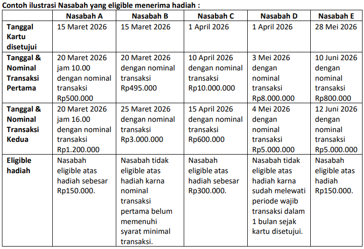 - Minimal nominal transaksi hanya dihitung adalah nominal transaksi nett yang pertama kali dilakukan setelah aktivasi Kartu Kredit (tidak berlaku akumulasi).