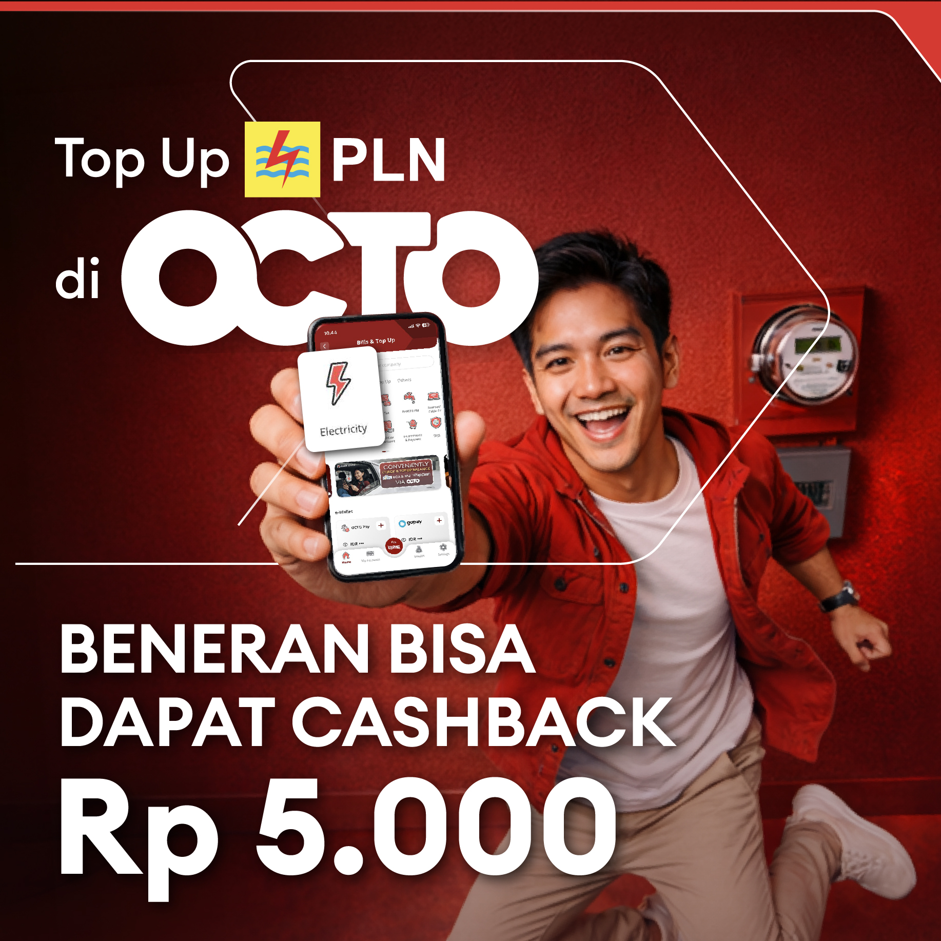 - Nasabah akan mendapatkan cashback Rp 5.000 dengan melakukan 1x transaksi pembayaran tagihan listrik (electricity bill) atau isi ulang token listrik (prepaid electricity) dari menu Bills & Top Up di OCTO.