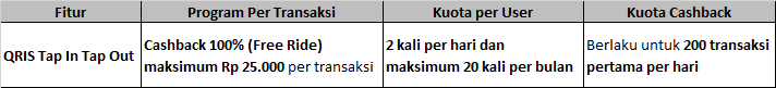 - Cashback untuk QRIS Tap In Tap Out di OCTO dengan rincian sebagai berikut :