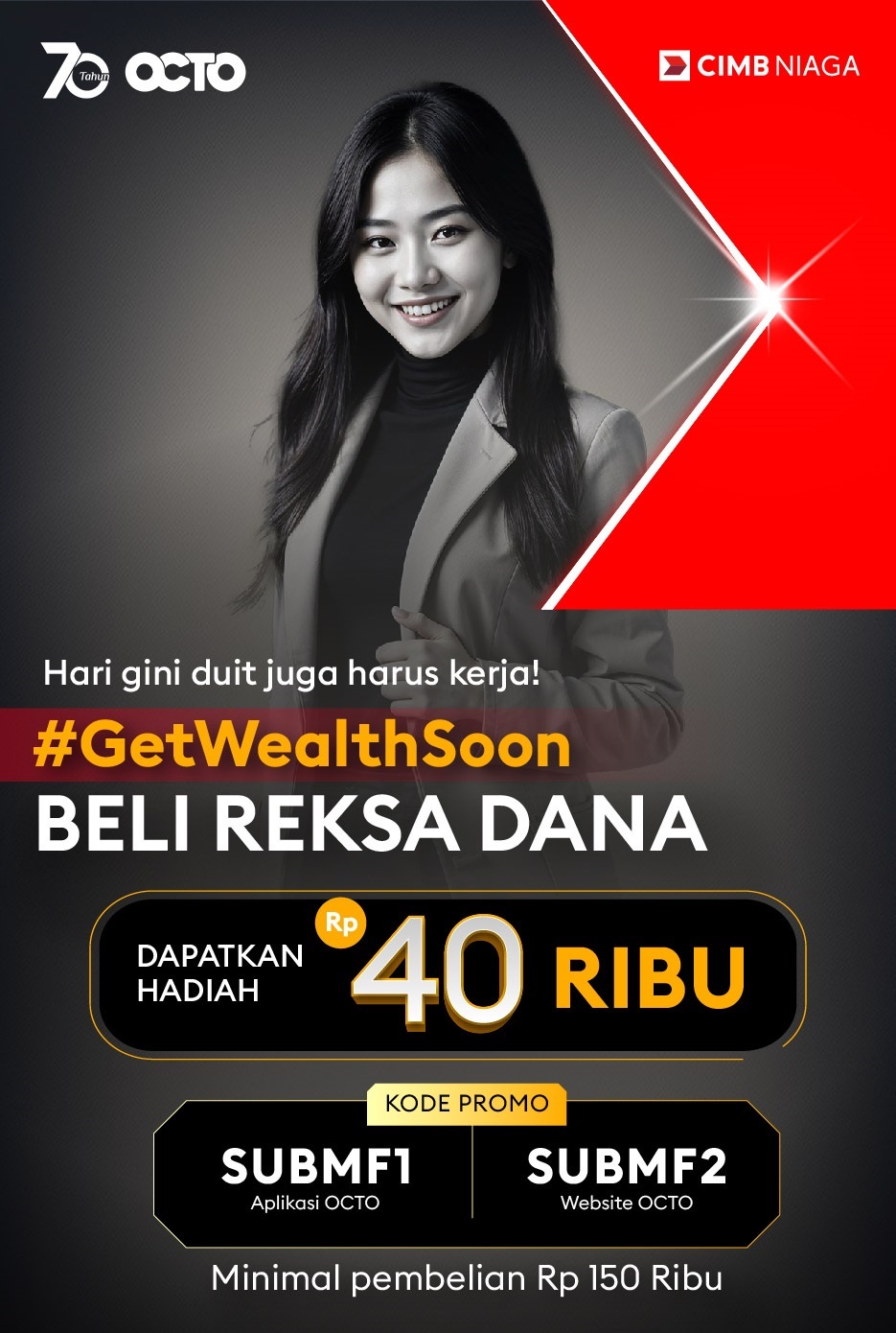 - Nasabah terundang wajib melakukan 1 (satu) kali pembelian Reksa Dana apa saja dengan jumlah minimum transaksi Rp 150.000 melalui Aplikasi atau Website OCTO.