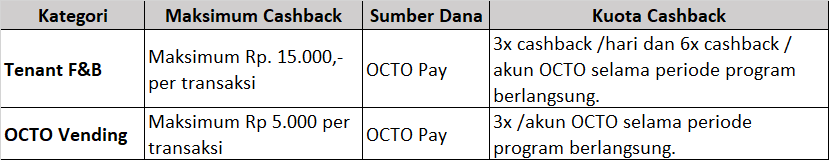 - Cashback 50% dengan scan QRIS OCTO, dengan rincian sebagai berikut :