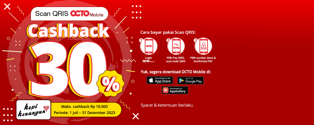 Cashback 30% di Kenangan Group (Kopi Kenangan, Kenangan Heritage, Kenangan Signature, Chigo, Flip Burger) dengan Menggunakan scan QRIS OCTO Mobile
