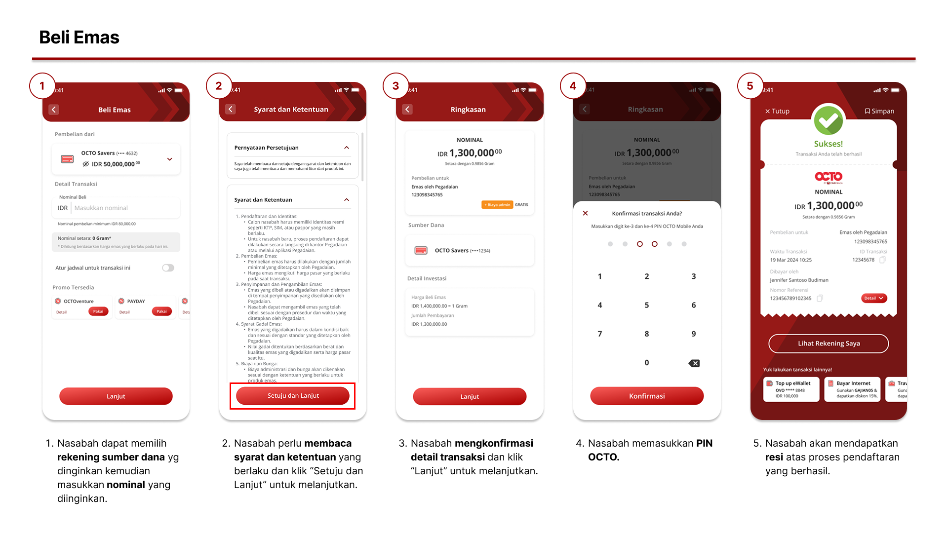 - Bagaimana cara membeli emas melalui di Aplikasi OCTO? Untuk membeli emas di Aplikasi OCTO Nasabah registrasi terlebih dahulu. Lalu, saat mengakses menu Emas oleh Pegadaian akan ada tombol Beli Emas, kemudian tentukan nominal dan jumlah emas yang ingin dibeli, dan lakukan transaksi menggunakan saldo yang tersedia di rekening.