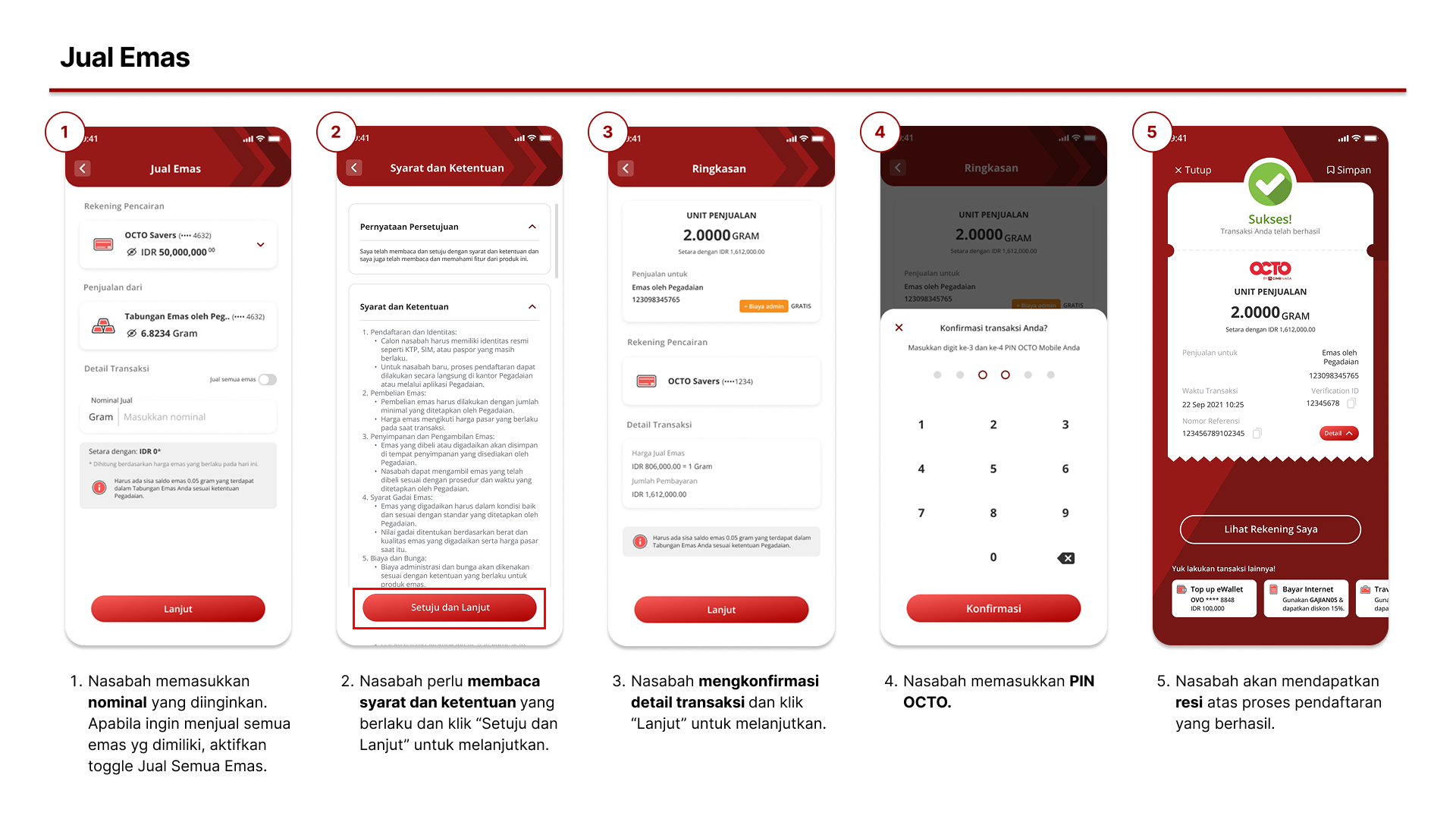 - Apakah saya dapat menjual emas yang sudah saya beli melalui Aplikasi OCTO? Untuk menjual emas Anda dapat diakses melalu menu Jual Emas pada menu Emas oleh Pegadaian, kemudian tentukan jumlah emas yang ingin dijual, dan transaksi akan diproses secara otomatis. Hasil penjualan akan langsung masuk ke rekening Anda.