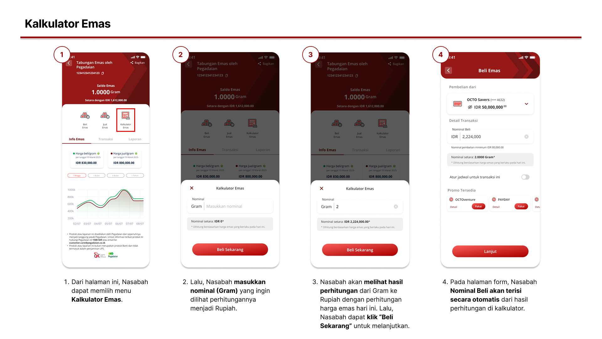- Apakah tersedia kalkulator untuk simulasi investasi emas di aplikasi? Kalkulator emas tersedia di Aplikasi OCTO pada detail rekening emas, kemudian pilih menu Kalkulator Emas.